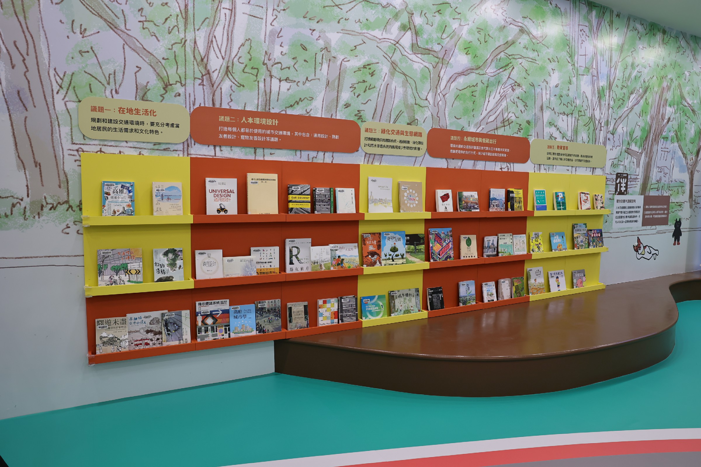 ↑圖說:設計原則展區精選人本交通相關書籍,讓讀者從五大面向認識人本交通(圖片來源:高雄市立圖書館提供)