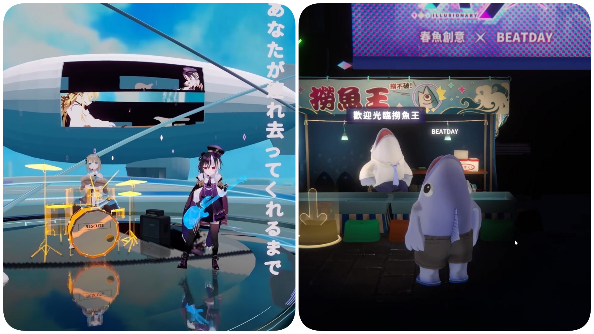 ↑圖說:「BEATDAY」娛樂平台打造全新互動環境,讓粉絲可以在虛擬世界中與心愛的偶像近距離接觸(左)。也可以實現透過專屬分身在虛擬的祭典中自由移動(右)。(圖片來源:高雄市文化局提供)