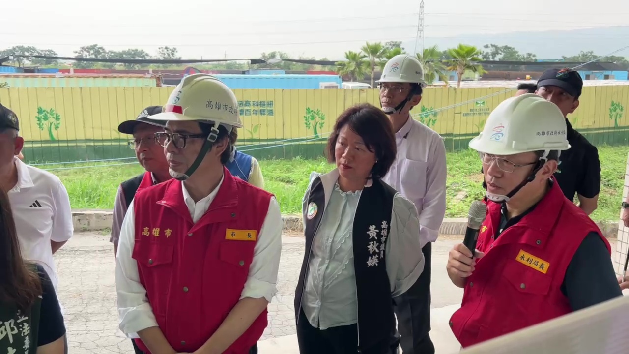 陳其邁首先前往三民區,由議長康裕成、副議長曾俊傑,市議員黃香菽、鄭孟洳、何權峰等人陪同,視察本和里滯洪池及棋琴12重奏大樓。他指示抽水站和滯洪池的操作人員務必堅守崗位,確保防汛設備正常運作。同時,由於棋琴12重奏大樓的地下室入口坡道施工尚未完成防水閘門的安裝,陳其邁立即指示區長與里長協助該大樓加強防颱措施,避免地下室再次淹水。在視察過程中,高雄市水利局也報告了三民區金獅湖出流閘門的改善計畫,通過提升閘門高度和改進操作方式,預計將金獅湖的滯洪量從原有的11.97萬噸提升至22萬噸,增加約10萬噸滯洪能力。