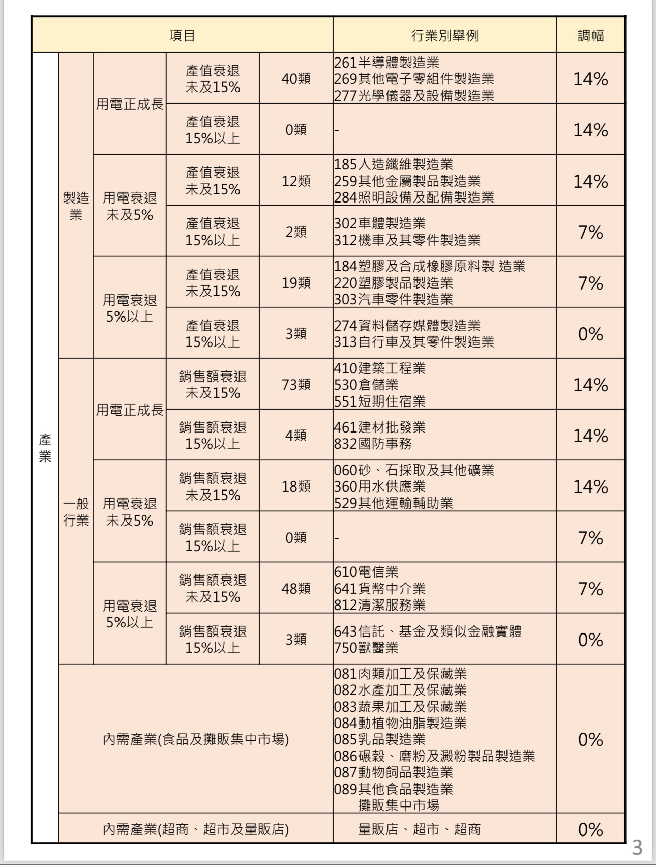 簡單說,用電或產值會一起看,兩個數字都衰退到頂的產業,電價凍漲;單一數字衰退到頂的產業,電價減半漲。