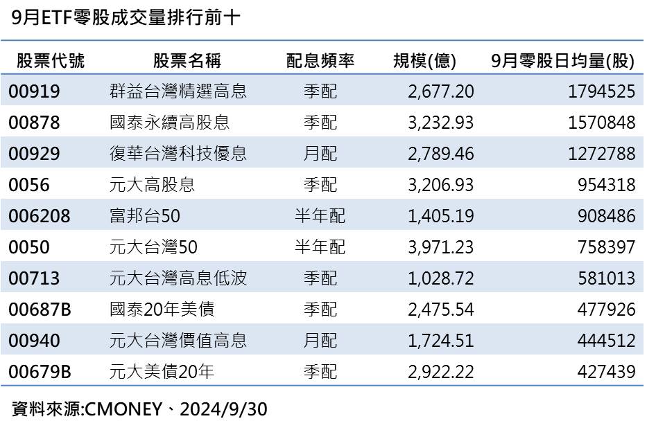 進一步來看,群益台灣精選高息ETF(00919)是9月ETF零股交易最熱門標的,其後依序是國泰永續高股息(00878)、復華台灣科技優息(00929)、元大高股息(0056)等。