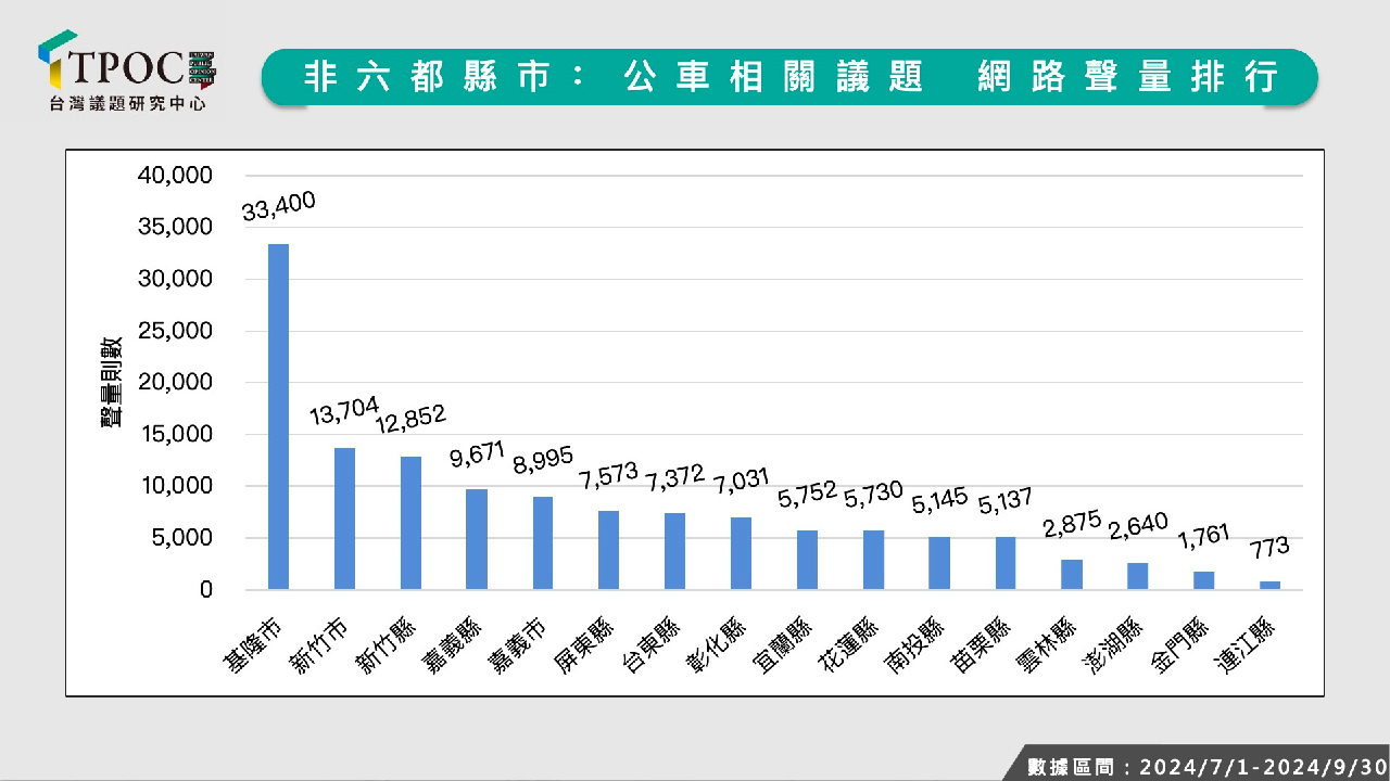 透過QuickseeK快析輿情資料庫的分析,近三個月內非六都縣市的公車相關議題聲量顯示,基隆市與公車相關議題有關的聲量,以33400則位居第一,成為唯一突破三萬的縣市,新竹市以13704則聲量居次,緊隨其後的是新竹縣(12852則)、嘉義縣(9671則)、嘉義市(8995則)。其他縣市如屏東縣(7573則)、台東縣(7372則)、彰化縣(7031則)、宜蘭縣(5752則)和花蓮縣(5730則)也名列前茅。