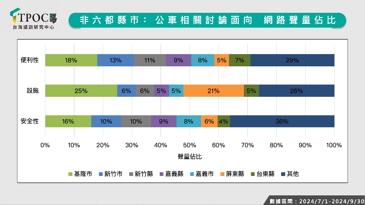 進一步從「安全性」、「便利性」、「設施」等三個面向分析各縣市的公車相關議題,在這三大面向中,討論聲量最多的是「便利性」,總聲量達4.4萬則,公車的覆蓋率、班次、轉成是否便利等成討論焦點。其次是「安全性」,聲量有1.9萬則,相關討論如駕駛司機是否違規、超速、闖紅燈、禮讓行人等。至於「設施」方面,討論聲量則是9.3千則,相關討論聚焦公車是否使用綠電、是否配有低底盤及無障礙設施等。其中,基隆市的「安全性」討論聲量佔非六都縣市的16%,屏東縣則在「設施」討論中占21%聲量,相對突出。而「便利性」方面,新竹縣、新竹市、台東縣分別佔13%、11%和7%的聲量成為亮點。