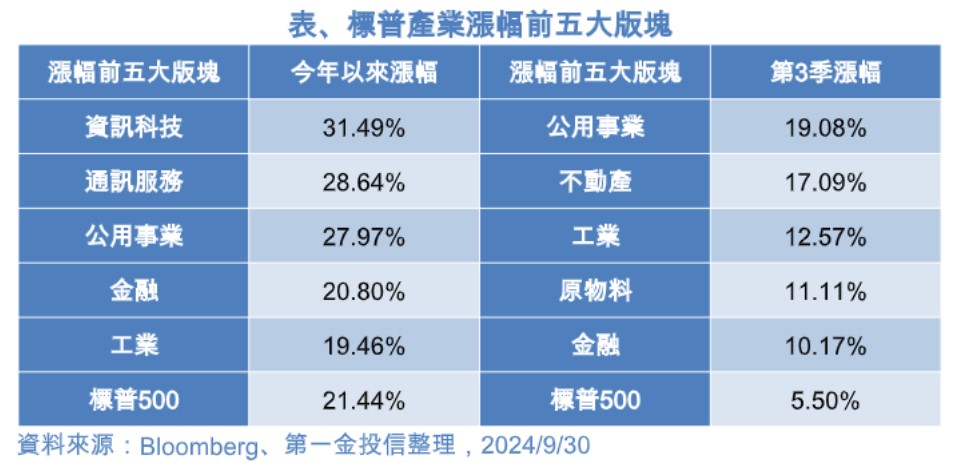 第一金投信統計今年以來,漲幅前五大版塊,在第三季出現轉變,公用事業、不動產、工業、原物料與金融等,漲幅在10%至20%間,大幅領先過去一季科技版塊僅1%左右的漲幅表現。