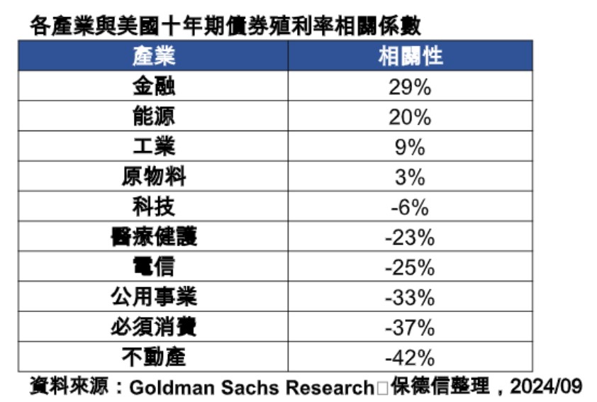 保德信指出,盤點各產業與美國十年期債券殖利率的相關性,以不動產的關聯度最低,看好利率下滑將大幅降低不動產與公用事業的融資成本,有利相關企業獲利成長,因此今年來包括不動產、公用事業屢屢獲得市場上調獲利預期。