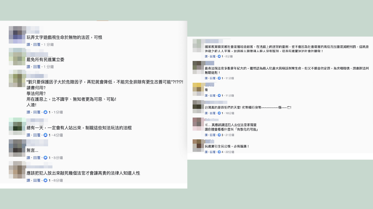 讀書何用? 學法何用? 用在護惡上,比不識字、無知者更為可惡、可恥! 人渣!」、「應該把犯人放出來敲死幾個法官才會讓高貴的法律人知道人性」、「台灣真的是罪犯們的天堂! 」
