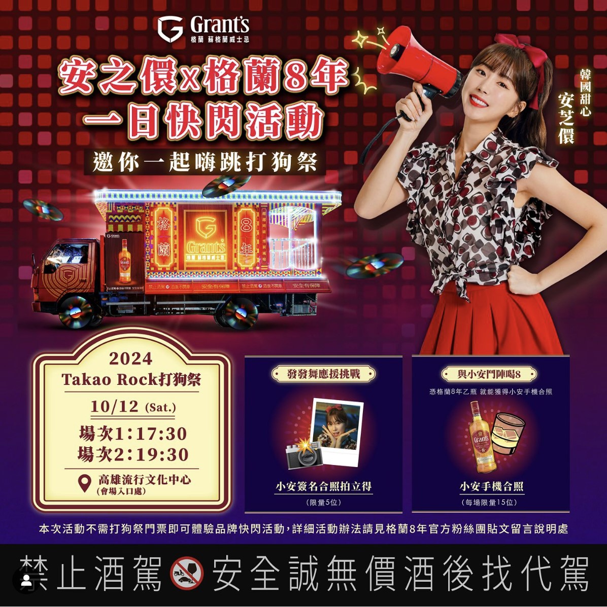 Takao Rock打狗祭今年不僅延續其音樂與文化的多元融合,還與TTXC台灣文化科技大會的主軸「FUTURE AT PLAY」呼應,展現出未來科技與文化交織的活力。特別值得一提的是,這次音樂祭更與高雄在地的職籃隊伍高雄全家海神隊合作,邀請球員們來到打狗祭現場欣賞演出。打狗祭粉絲更可以在音樂祭結束後,持今年打狗祭的入場手環或購票憑證,享有10月19、20、26及27日四場海神隊高雄巨蛋主場賽事的現場購票「1A區買一送一」優惠,為球迷和音樂迷帶來雙重盛宴。除了體育與音樂的跨界合作,今年的打狗祭也得到了眾多品牌的支持,包括Samsung、台灣麒麟KIRIN Bar Beer、純喫茶、可樂果、Red Bull及北海鱈魚香絲等,將在現場提供粉絲們暢快體驗。而Grant's格蘭8年蘇格蘭威士忌更是邀請了台鋼雄鷹啦啦隊員安芝儇在10月12日(六)分兩場進行快閃見面會,為音樂祭增添更多的活力與互動。