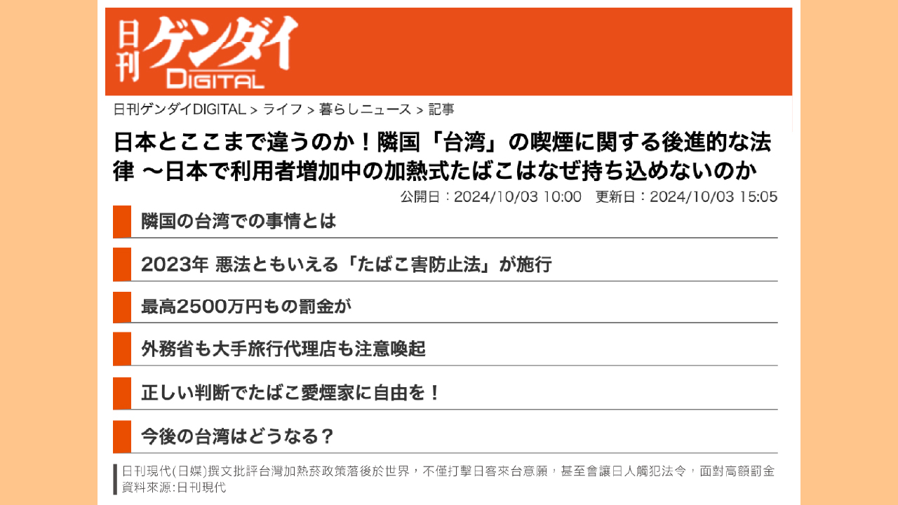 點名批評台灣的,是日本最大出版社講談社旗下的日刊現代,報導標題就點名『跟日本有那麼不一樣嗎?鄰國「台灣」的吸菸法規落後—日本使用日益增多的加熱菸為什麼不能帶進來?』報導強調台灣對菸草類產品管制重點仍在防制二手煙危害,但2023年修正公布的菸害防制法,納管加熱菸,卻遲遲不准加熱菸的販售。