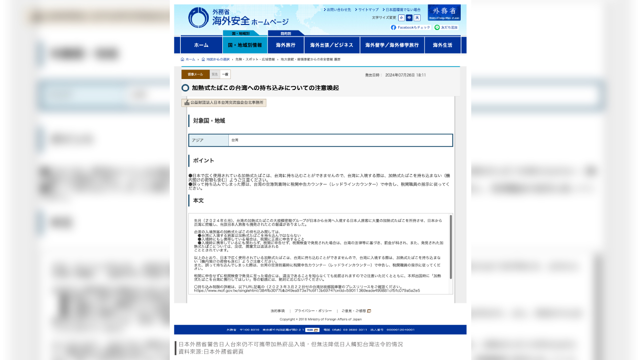 ↑圖說:日本外務省警告日人台來仍不可攜帶加熱菸品入境,但無法降低日人觸犯台灣法令的情況。(圖片來源:翻攝自日本外務省網頁)