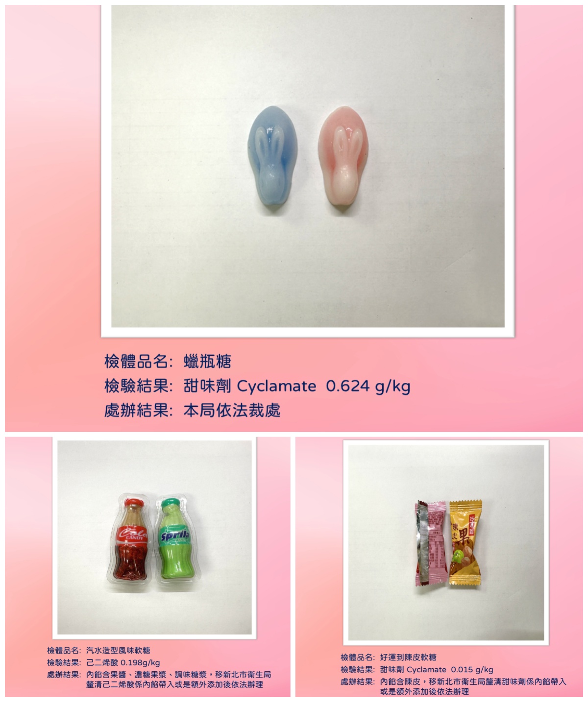 ↑圖說:1件蠟瓶糖(上)檢出甜味劑不符規定,已依《食品安全衛生管理法》裁罰並要求下架銷毀;另有2件軟糖(下)分別檢出甜味劑與防腐劑不符規定(圖片來源:高雄市衛生局提供)