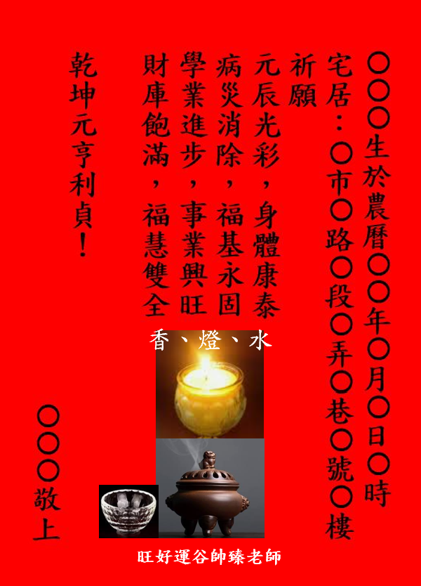 用紅紙黑字製作個人「祈願元辰紙」寫上最想達成的願望,如下範例。