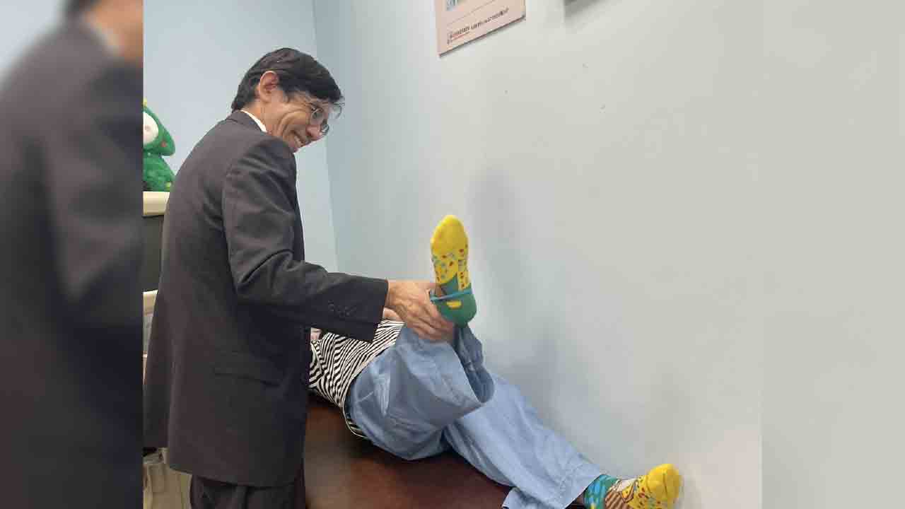 ↑圖說:李光申醫師教導患者媽媽如何幫服務對象進行腳拉筋,舒緩腳後跟疼痛。(圖片來源:瑪利亞基金會提供)