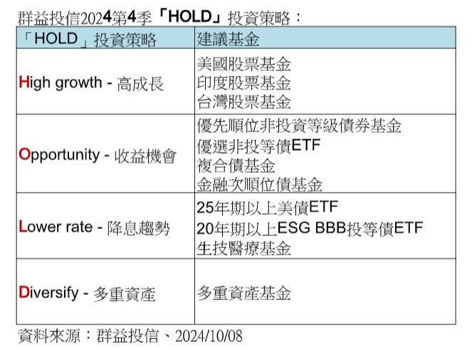 群益投信發布第四季投資展望,研判儘管市場仍有美國大選議題的干擾,不過整體來看,第四季在旺季效應與降息加持下,行情依舊可期,建議可透過資產配置來掌握市場行情,或藉此強化投資組合收益與波動控管的能力,建議可採用「HOLD」配置策略來因應。