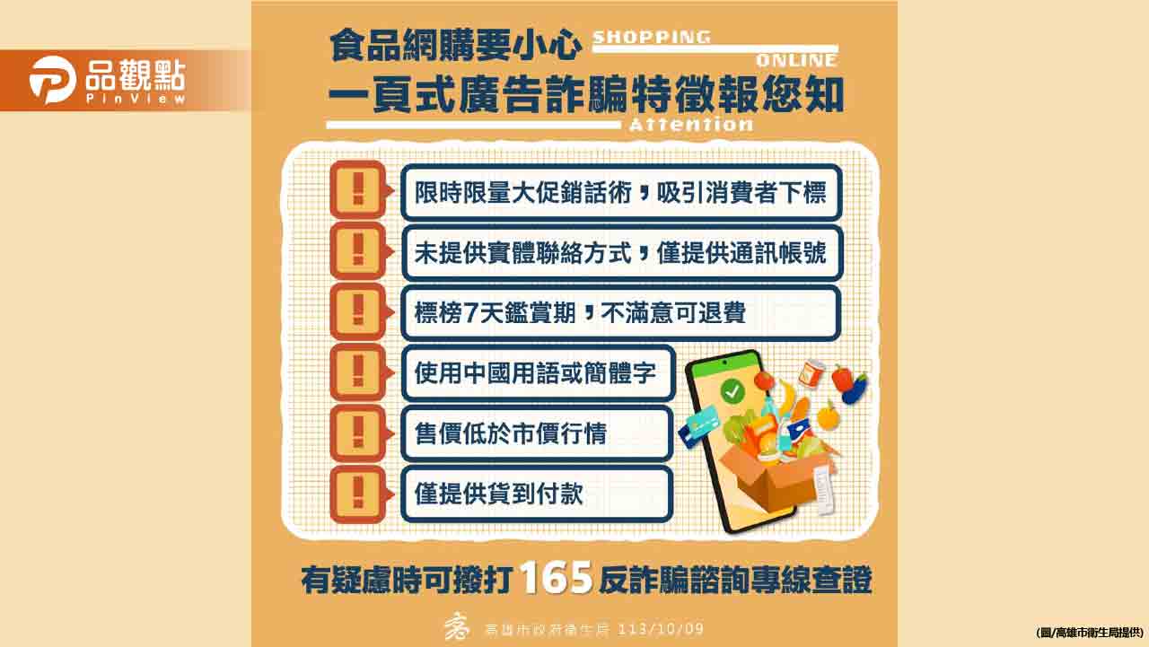 高雄市衛生局近日查察發現「無良食品業者」利用「一頁式廣告」詐騙手法,於網路以中國食品冒稱高雄名產進行販售,經檢視包裝標示為簡體字、IP設址在國外,網站雖標榜產品產地為台灣,實際則來自中國,並搭配誘人食材照片、生動介紹詞句,誘騙不知情消費者下單,衛生局將主動稽查產品發貨地點業者,並移請司法單位進一步追查。