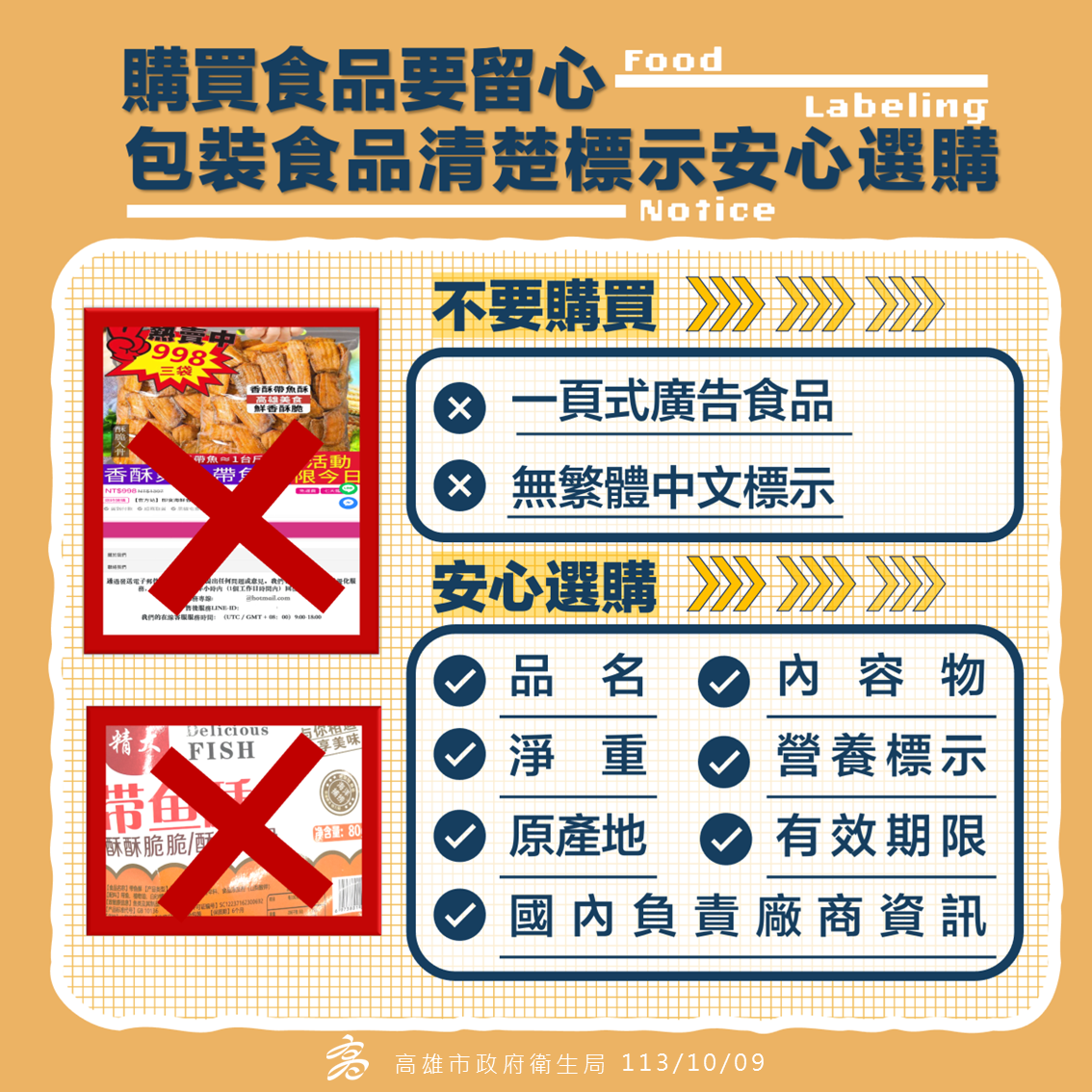 衛生局提醒消費者「一頁式廣告」虛實難辨,最好認明品牌,勿上有問題的食品網站,並提醒採購網路食品應認清以下完整包裝標示,以確保食的安全:1.繁體中文標示,2.品名,3.內容物名稱,4.淨重、容量或數量,5.製造廠商或國內負責廠商名稱、電話號碼及地址,6.有效日期,7.原產地(國),8.營養標示,9.食品添加物名稱,10.含基因改造食品原料,11.其他經中央主管機關公告之事項。若買到問題產品應立即向各地方衛生局檢舉。倘有消費或爭議問題,撥打消費者專線1950,市府消保官可協助洽業者進行協調。