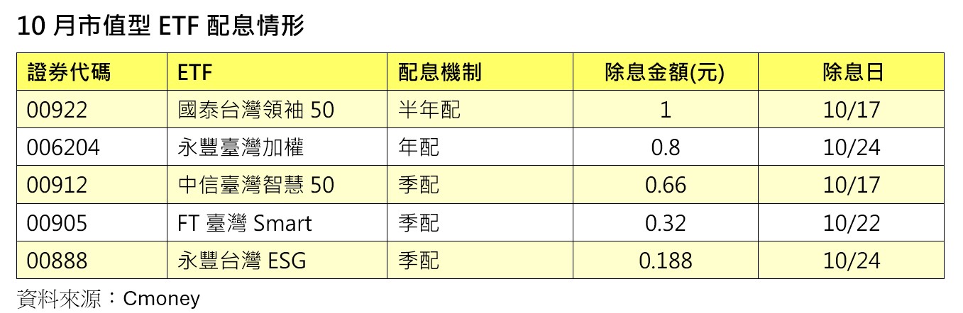 即將除息的台股市值型 ETF,分别是國泰台灣領袖50(00922),擬配息1元、永豐臺灣加權(006204)擬配息0.8元、中信臺灣智慧50(00912)擬配息0.66元、FT臺灣Smart(00905)擬配息0.32 元,以及永豐台灣ESG(00888)配息0.188元。