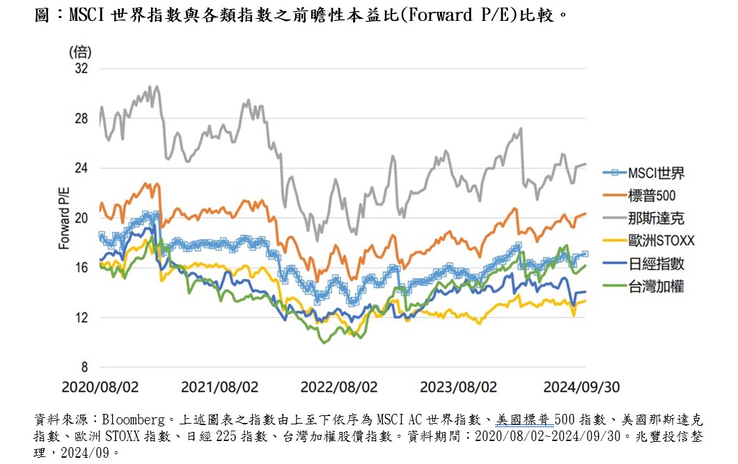 兆豐投信認為,美國總統大選愈來愈近,中東局勢亦伺機震盪。根據彭博資料,近期MSCI世界指數與美國、日本、臺灣等各重點指數的前瞻性本益比走勢,顯示全球金融市場在波動中尋求趨穩。隨著國際貨幣政策偏寬鬆,資金持續輪動,建議長期核心資產可以納入多重資產策略,相對能透過「股票、債券、ETF」等各類多元題材組合,抵禦市場下檔風險的機率。