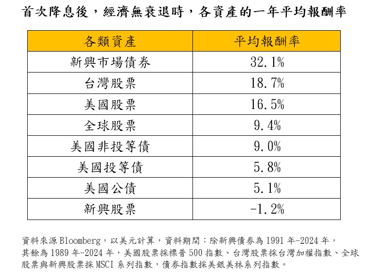 美聯準會睽違四年降息2碼,「鉅亨買基金」回測過去經驗,模擬若在聯準會首次降息當月底進場,在經濟未衰退的前提下,新興市場債券、台股和美股一年後表現最佳,平均報酬率分別為32.1%、18.7%和16.5%。