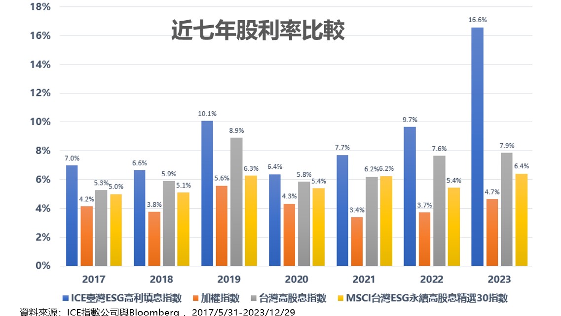 統計發現,ICE臺灣ESG高息指數,在上述統計期間,表現最佳的是2023年,當年股利率高達16.6%,勝過台灣高股息指數的7.9%,以及MSCI台灣ESG永續高股息精選30指數的6.4%,同時,也遠遠超越台股的4.7%。