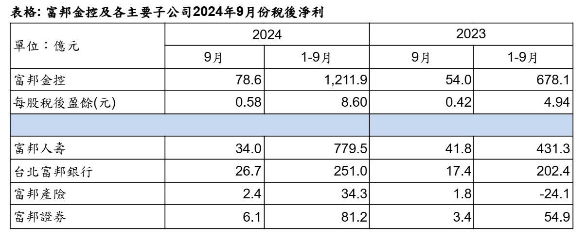 子公司台北富邦銀行、富邦證券累計前9月獲利皆續創歷年同期新高,富邦人壽為歷史第三高。