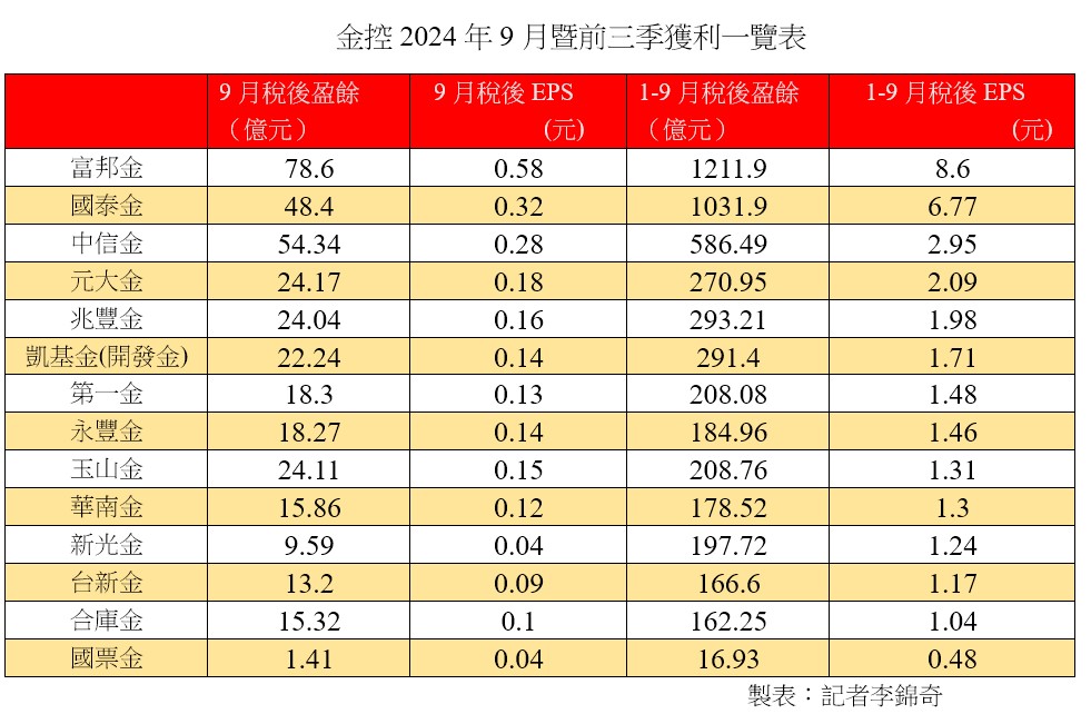 金控9月暨前三季獲利出爐!富邦金9月自結稅後淨利78.6億元,創歷年新高,單月每股稅後盈餘(EPS) 0.58元;累計今年前9月稅後淨利1211.9億元,歷年同期次高,稅後EPS 8.6元,持續蟬聯金控獲利王。