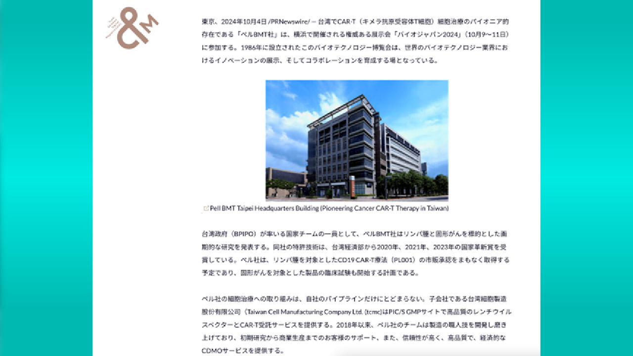 致力耕耘基因改造 CAR-T 抗癌細胞療法領域的沛爾生醫(6949),今年獲經濟部生技醫藥產業發展推動小組(BPIPO)邀請參加10/9-10/11在日本橫濱舉行的BioJapan生技博覽會,向全球生技藥廠展現沛爾生醫在CAR-T領域的核心技術及研發成果,各大國際藥廠驚艷於台灣在細胞與基因治療(Cell and Gene Therapy, CGT)產業上的發展,吸引日本媒體大幅報導。沛爾生醫表示,此行成果豐碩,許多藥廠主動洽詢合作機會,盼藉此增進國際交流,打響台灣生醫國家隊名號。