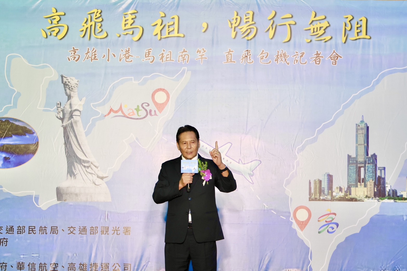 為促進高雄與馬祖之間的觀光交流,「高飛馬祖 暢行無阻」高雄直飛馬祖南竿的包機服務14日正式啟動。高雄市長陳其邁與交通部次長林國顯、連江縣長王忠銘及地方代表、觀光業者一同出席記者會,參與啟動儀式,象徵兩地航線重啟。隨後,眾人還一同品嘗馬祖的特色美食,為這項睽違20年的航線復航揭開序幕。