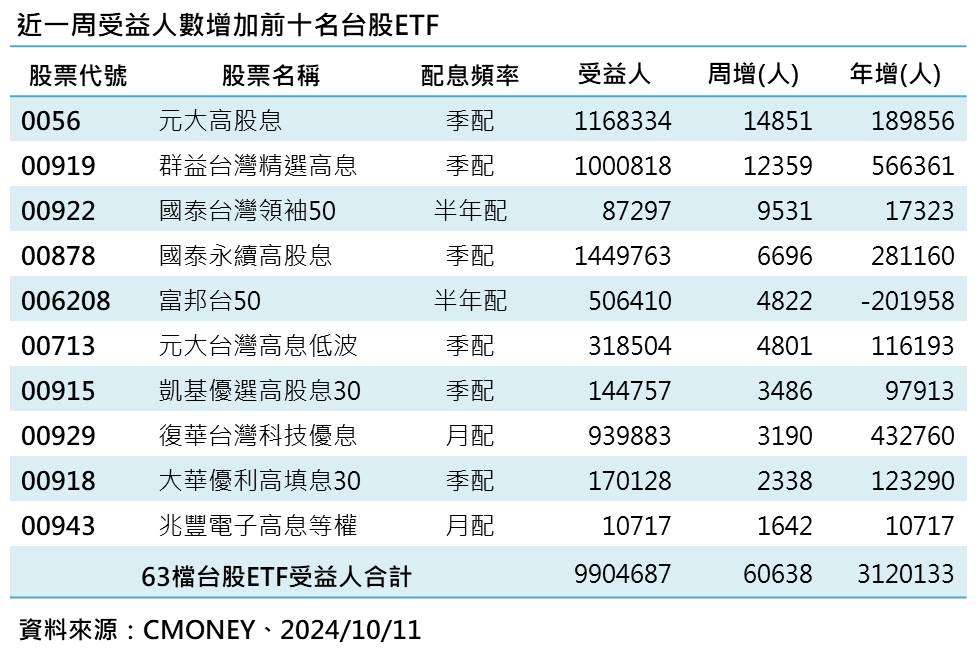 63檔台股ETF受益人數再創新高,最新一周增加6萬638人,來到990萬4687人,其中有31檔受益人增加,前三名依序是以元大高股息(0056)與群益台灣精選高息(00919)、國泰台灣領袖50 (00922),值得一提的是,00919受益人突破百萬,成為第三檔百萬國民ETF。