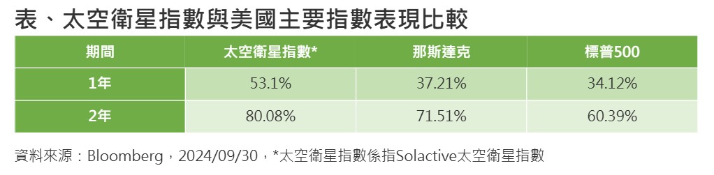 曾萬勝強調,科技產業加入太空戰局,帶動新一波的太空衛星成長動能,包括:數位運算導入太空、火箭發射及回收技術讓太空旅遊成真,太空商機不再只是遙不可及的夢,過去兩年市場關注創新題材,科技股頻創新高,代表太空衛星產業的Solactive太空衛星指數,近兩年漲幅高達80%,超越美股主要指數。