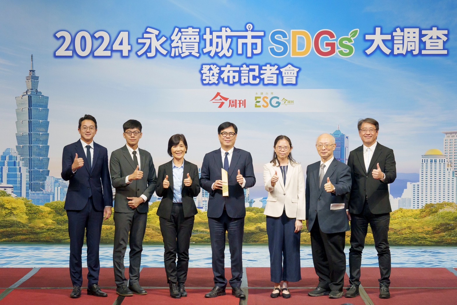 ↑圖說:2024年度「永續城市SDGs大調查」高雄市榮獲「最佳首長信任獎」、「最佳高齡友善城市獎」、「經濟力特別傑出獎」、「環境力特別傑出獎」、「永續城市特優獎」及「永續創新-環境獎」等六項大獎,陳其邁率市府團隊出席領獎,感謝市民肯定。(圖片來源:高雄市政府提供)