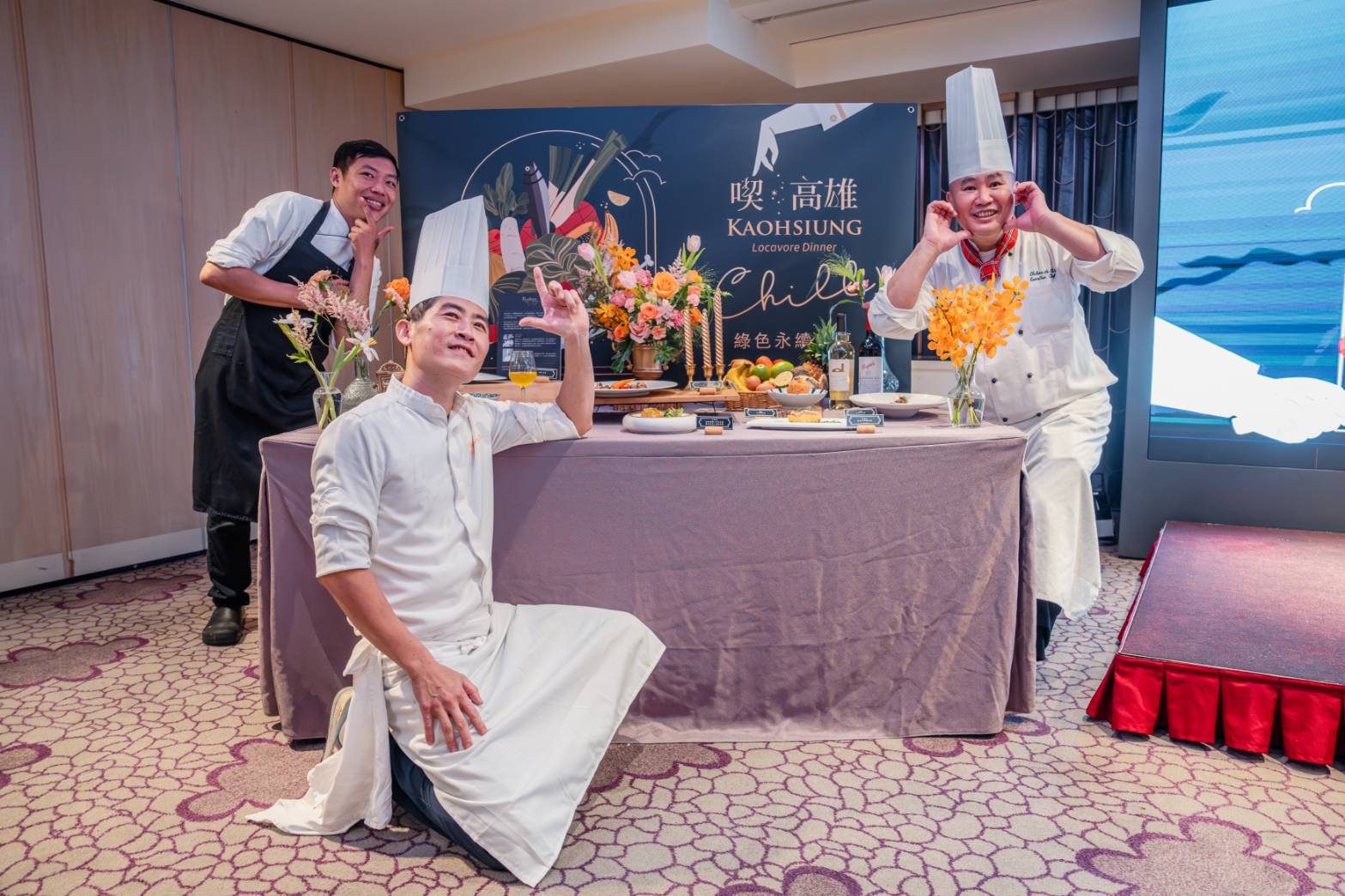 ↑圖說:三位大廚(由右至左:高雄翰品酒店行政主廚江進華、雅樂廚苑主廚蔣秉豐、帕莎蒂娜法式餐廳廚藝行政主廚許志興)與「綠色永續餐桌」八道創意料理合影。(圖片來源:高雄市農業局提供)