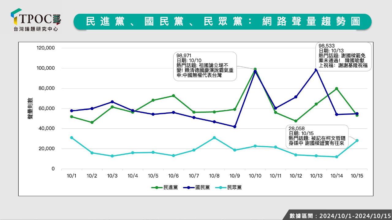 TPOC台灣議題研究中心透過QuickseeK快析輿情資料,蒐集10月以來三個政黨的網路聲量趨勢和多個高峰點熱門話題,結果發現,三黨獲得高聲量的話題僅部分重疊,尤其藍綠兩黨最獲熱議的話題環繞兩岸,數值與其他議題差距甚大。民進黨方面,其聲量高峰話題包括:賴清德在10月10日國慶演說維持「祖國論」基調,重申中國無權代表台灣,呼籲中國回應世界對其維護和平的期待,獲得超過9.8萬則超高聲量。10月14日中共發動圍台軍演,國安會秘書長吳釗燮透露府方舉行國安高層會議,強調國軍有適當處置,也獲得超過7.9萬則聲量。