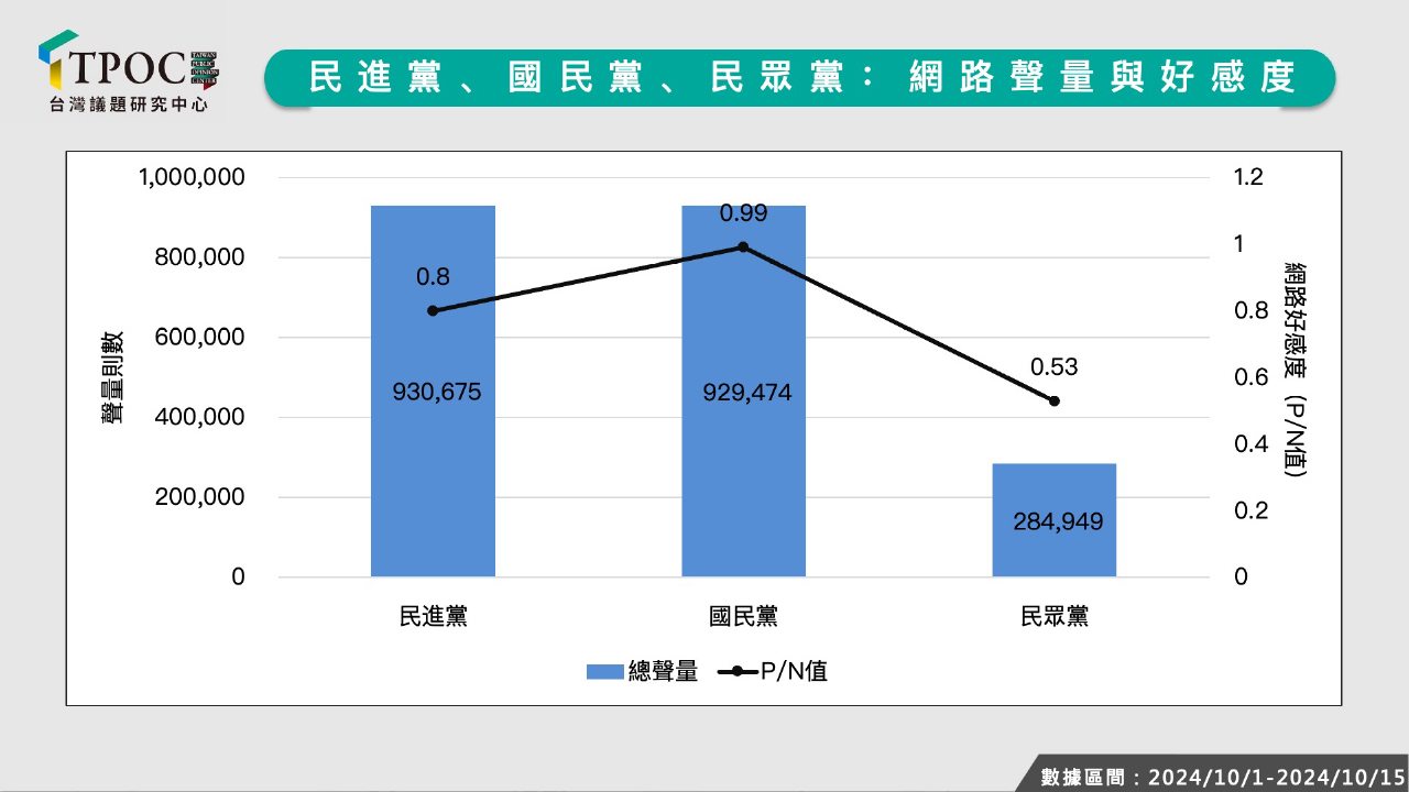 總體而言,在調查期間內,民進黨總聲量超過93萬則居冠,國民黨則以總聲量92.9萬則緊追在後,此外,網路好感度方面,國民黨好感度奪冠,數值為0.99,透過國民黨的正面聲量熱門文章分析原因,國民黨得力於藍營大咖在國慶期間的發言、謝國樑順利挺過罷免案等事件,使藍營支持者們大感振奮,穩坐好感度冠軍。而民進黨的熱門話題內容種類多元,包括前總統蔡英文親自發聲「啟程訪歐」, 喊話持續深化台歐關係,以及立委黃捷入選《時代》次世代百大人物等,都引來正面迴響,使其的網路好感度約為0.8居次。至於民眾黨,總聲量約28.4萬則,好感度僅0.53,無論是曝光度或者好感度,均大幅度遜於藍綠陣營。