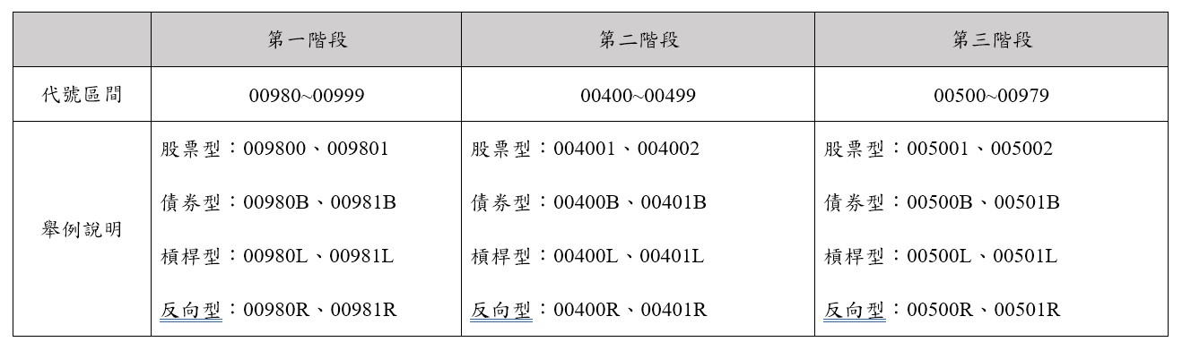 證交所說,新制會採三階段實施,第一階段,股票型ETF會由009800、009801依序取號,債券型由00980B、00981B依序取號;等到代號用罄,就進入第二階段,股票型由004001、004002依序取號,債券型00400B、00401B依序取號。
