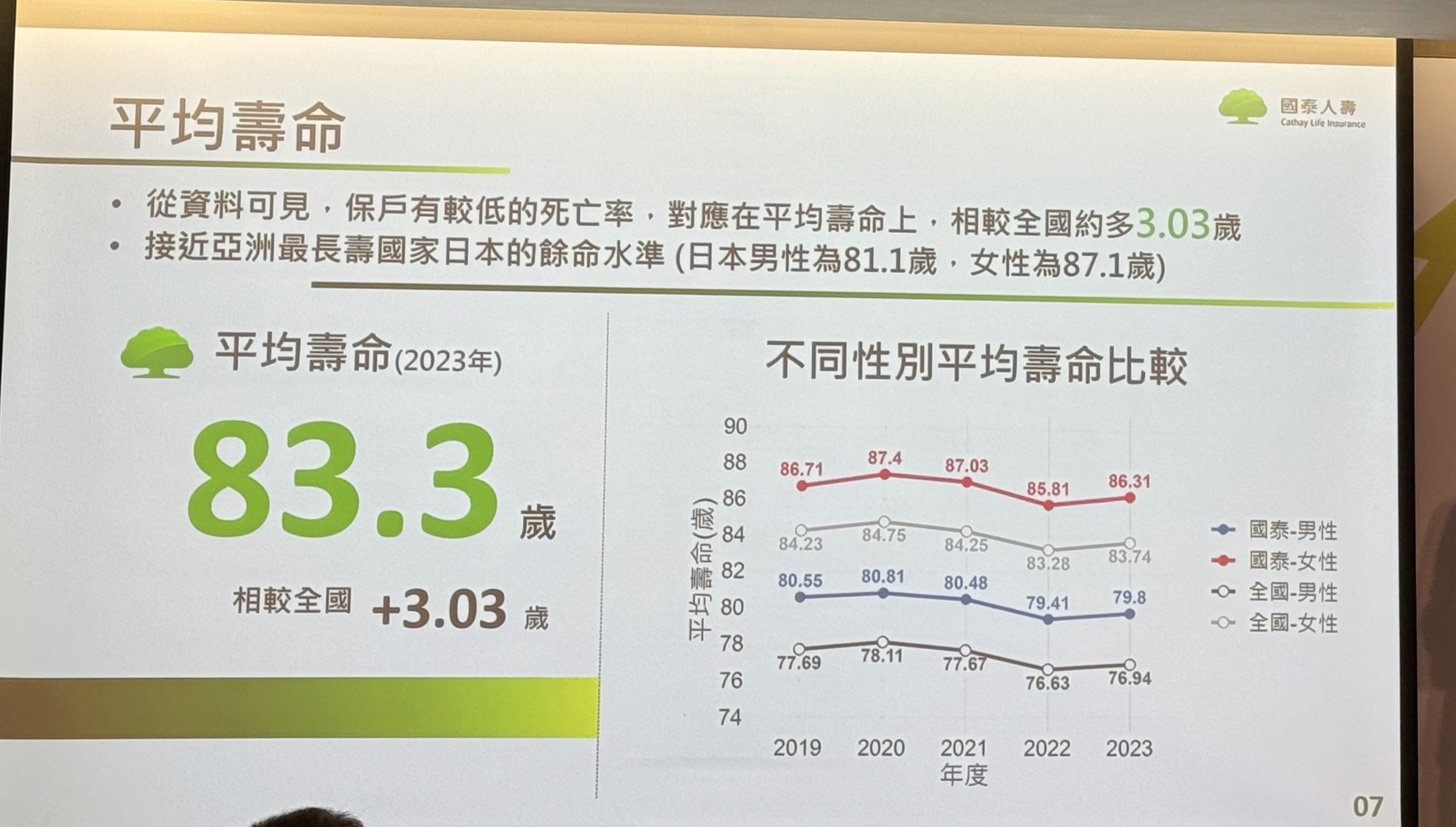 國泰人壽今天發表《2024國泰人壽保戶健康年報》,是國內首家保險公司發布保戶健康研究成果,這項研究是以國壽800萬名保戶資料為基礎,透過各種健康指標進行剖析,發現保戶3大健康指標,包括平均壽命較國人延長3歲、可避免死因死亡率低於全國、罹癌後5年存活率高於全國。