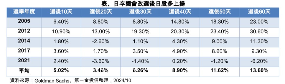 日股十月中旬以來拉回整理,部分原因是市場觀望日本眾議院國會改選,與日本央行利率決策會議結論。第一金量化日本基金經理人黃筱雲指出,近20年日本歷次國會改選結束後,隨政局趨於穩定,有利股市走升、統計過去20年期間五次國會改選,從選後10天至60天股市漲多跌少,且拉長時間來看,平均漲幅由3%~5%,擴大至10%以上。