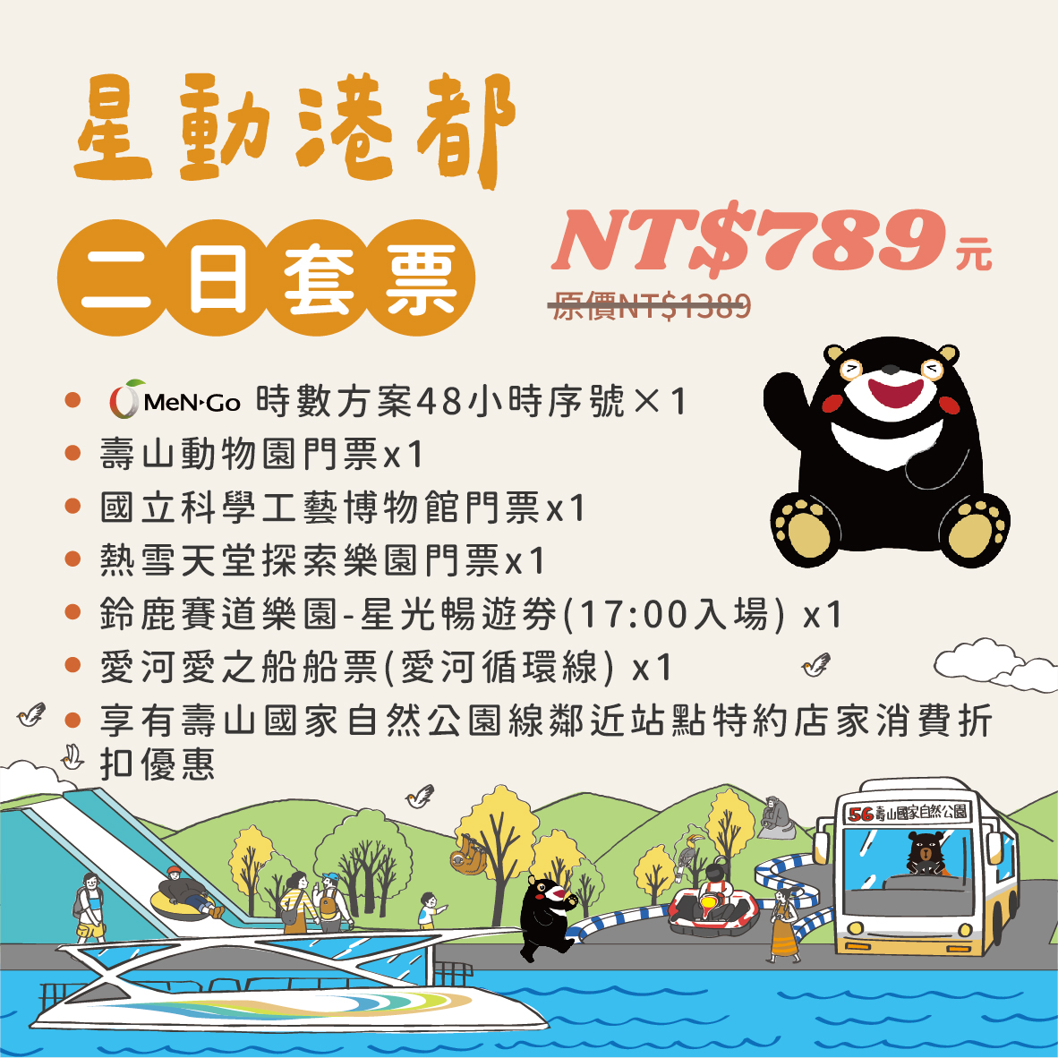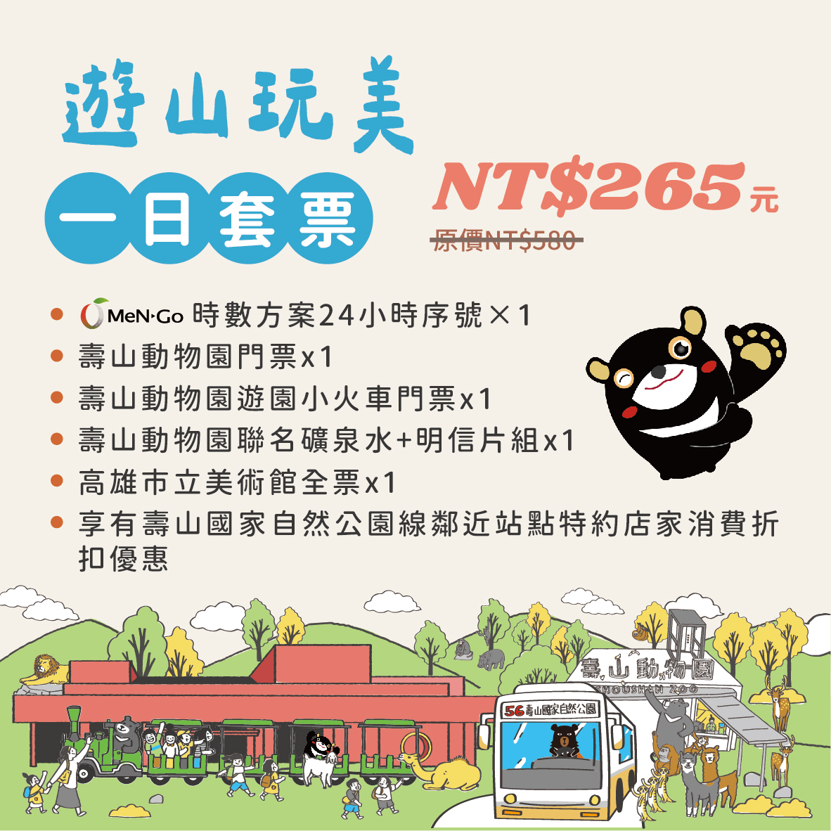 高雄市交通局推出的「遊山玩美一日套票」與「星動港都二日套票」提供了超值的旅遊體驗,適合不同需求的旅客。「遊山玩美一日套票」包含MeNGo 24時數票QR方案、壽山動物園(含遊園小火車)門票、壽山動物園聯名礦泉水+明信片組、高美館門票,售價265元(原價580元),為原價46折;「星動港都二日套票」包含MeNGo 48時數票QR方案、壽山動物園門票、科工館(含熱雪天堂探索樂園)門票、鈴鹿賽道樂園-星光暢遊券及愛河愛之船船票,售價789元(原價1389元),為原價57折,旅客可依照規劃旅遊行程,在指定線上通路購買一日或二日套票,隨時買隨時用。