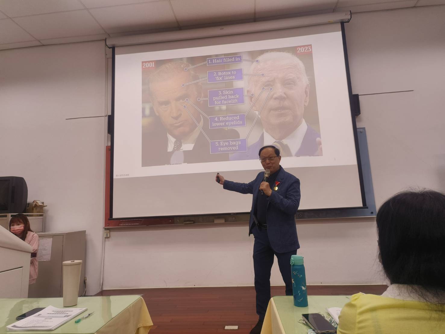 曹賜斌也分享,就連總統也需要整形,前總統統馬英九及美國總統拜登也都有做過手術整形,期能藉由年輕的外觀維持政治聲望及職涯長青。不過國稅局人員從手術前後對比照中,認為馬英九先生眼皮整得有點不自然、不好看,曹賜斌解釋是因「眉壓眼」造成,選錯醫療術式有時也會使結果適得其反。