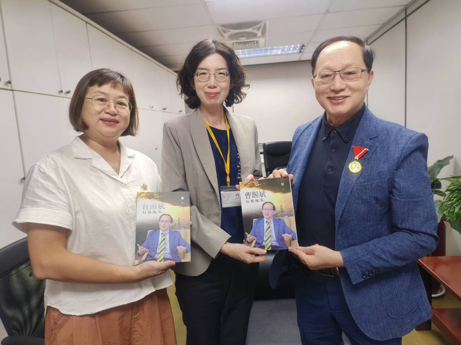 圖說:曹賜斌(右)贈送新書給高雄國稅局。(圖片來源:曹賜斌整外診所提供)