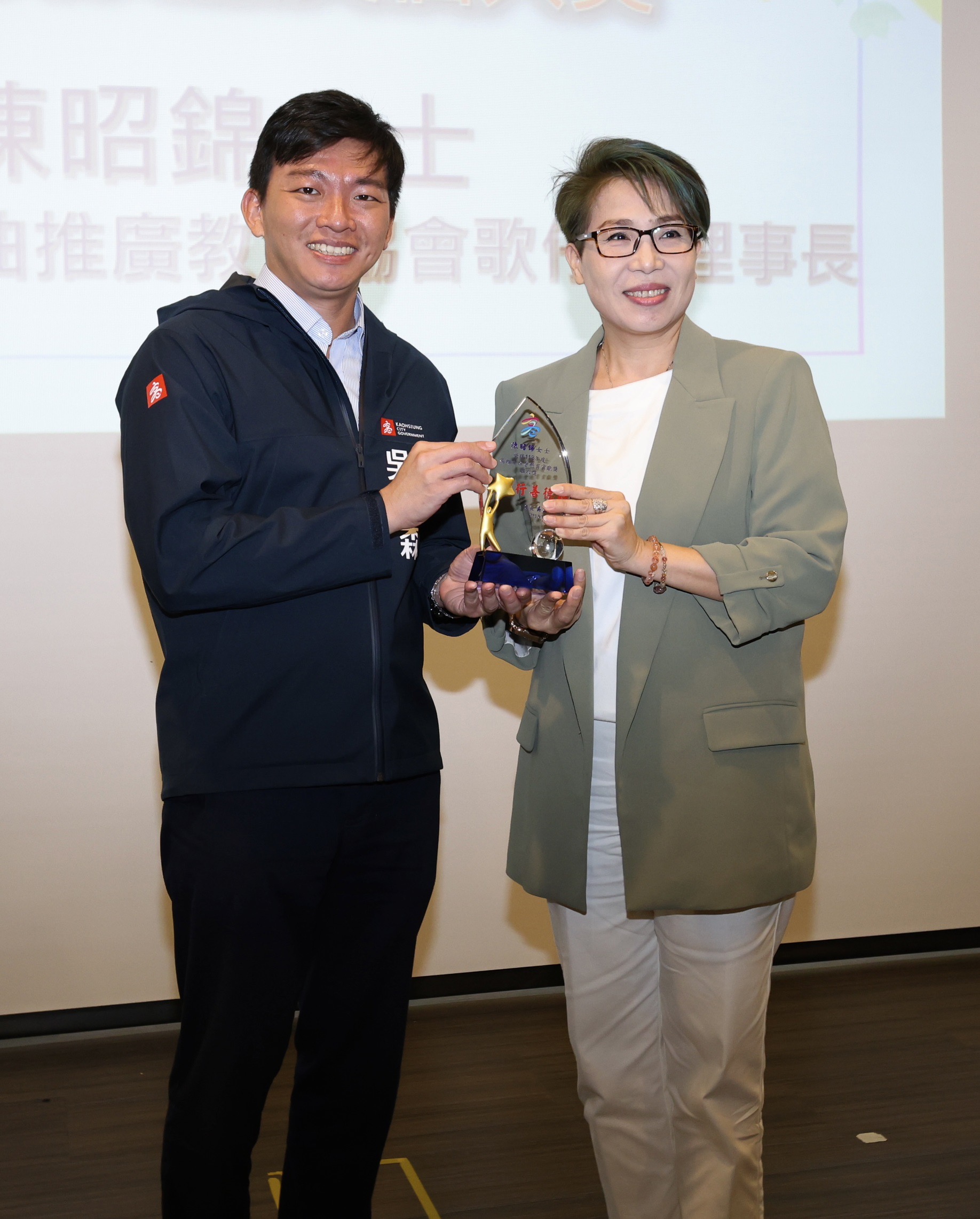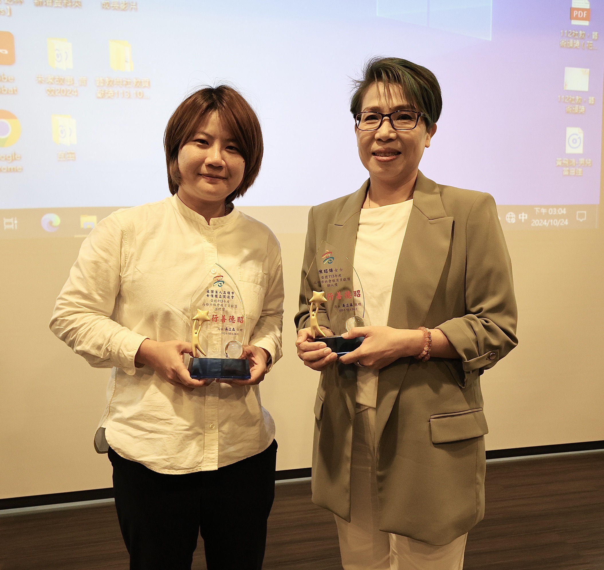 ↑圖說:社團法人高雄市女性權益促進會(左)、高雄市傳統戲曲推廣教育協會理事長陳昭錦(右)今天也分別再獲得教育部全國社會教育貢獻獎團體與個人殊榮。(圖片來源:高雄市教育局提供)
