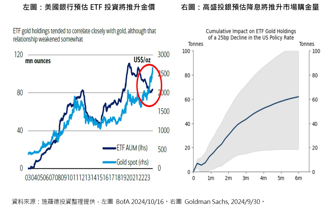 全球利率走降,林良軍解釋,持有黃金的機會成本就是利率,隨著機會成本降低,降息對持有黃金意願有推波助瀾的效果,加上黃金可對沖地緣政治衝突和衰退風險,下方右圖由高盛預估,Fed每調降一碼,對金價的需求有增無減。