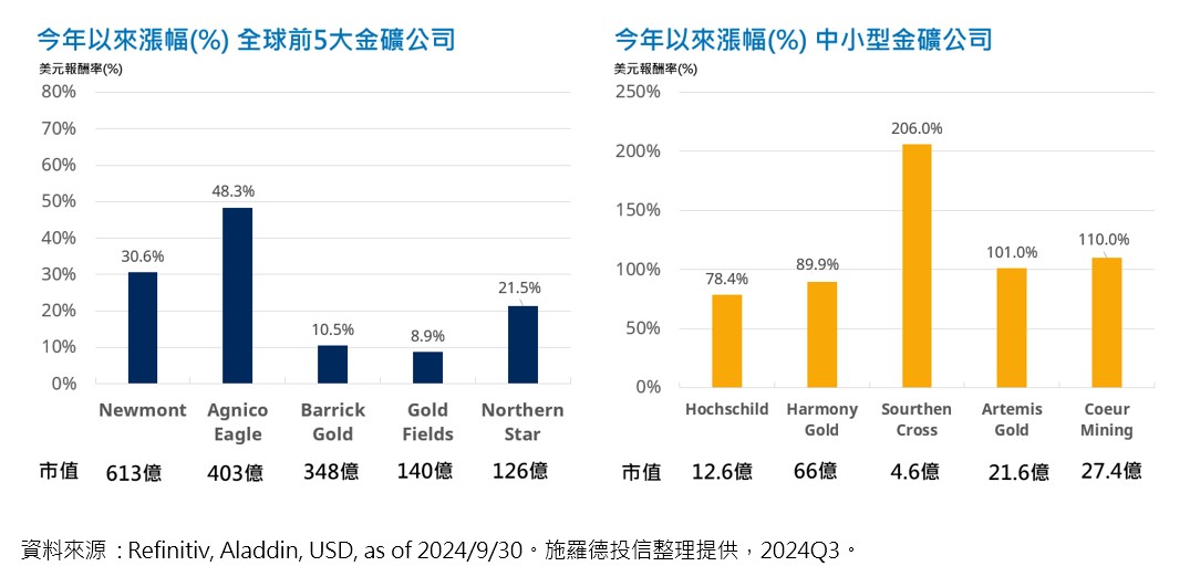 以第一個特色來說,下方比較大型金礦公司與中小型金礦公司今年以來的漲幅,中小型爆發力見真章。