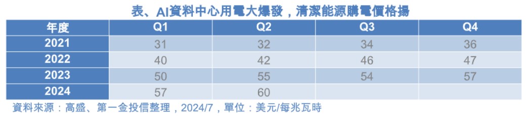 統計2021年至今,受惠AI資料中心用電需求大爆發下,包括太陽能、風電等清潔能源的需求不斷揚升,美國未來5年的電力需求預期最大上調幅度至每年6%,全球今、明年的電力需求年增率也提高至4%,林志映看好,清潔能源領域能夠滿足較立即性AI資料中心用電需求,高盛統計,美國清潔能源購價格年年上調,由2021年初的每兆瓦時31美元,今年中已來到每兆瓦時60美元。