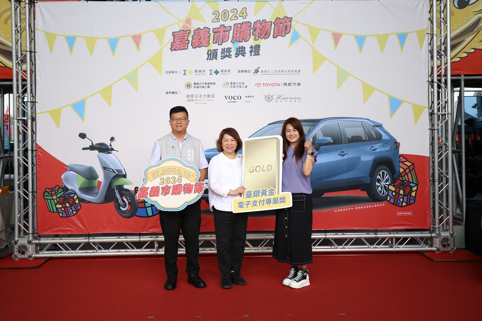 在2024嘉義市購物節的頒獎典禮上,市長黃敏惠特別感謝嘉義市不動產商業同業公會已連續4年贊助購物節,提供電動機車作為獎項;此外,嘉義市旅館商業同業公會也連續5年支持「住宿送600嘉遊金」活動。今年,有23家特約旅宿和478家特約店家熱情參與,並特別感謝耐斯王子大飯店、嘉義福容voco酒店、新悦花園酒店等贊助頂級房型住宿券,藉此鼓勵更多民眾來嘉旅行,進一步帶動在地消費。