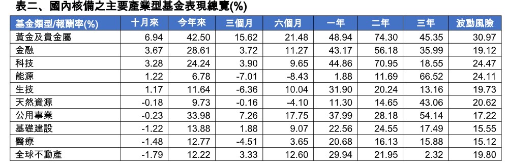 境外基金10月績效表秒懂!黃金基金再飆7%居冠 美台股基金領先