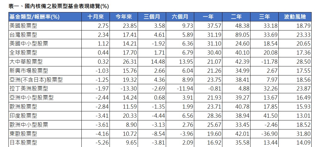 至於台股基金上漲2.34%,也領先其他地區;相對地,日股基金10月以來下跌5.26%,表現墊底。