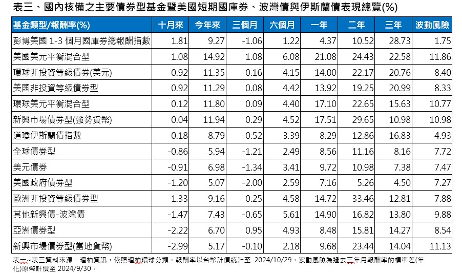 主要債券及平衡型基金部分,近月以來,美國公債殖利率大幅走揚,主要是受聯準會可能不會快速降息、中東局勢不穩、川普可能勝選等因素影響,讓債市呈現漲跌互見格局,值此不確定因素更多之際,美國短期國庫券表現穩健,上漲1.81%,而美國平衡型基金也有穩健表現,上漲1.08%。