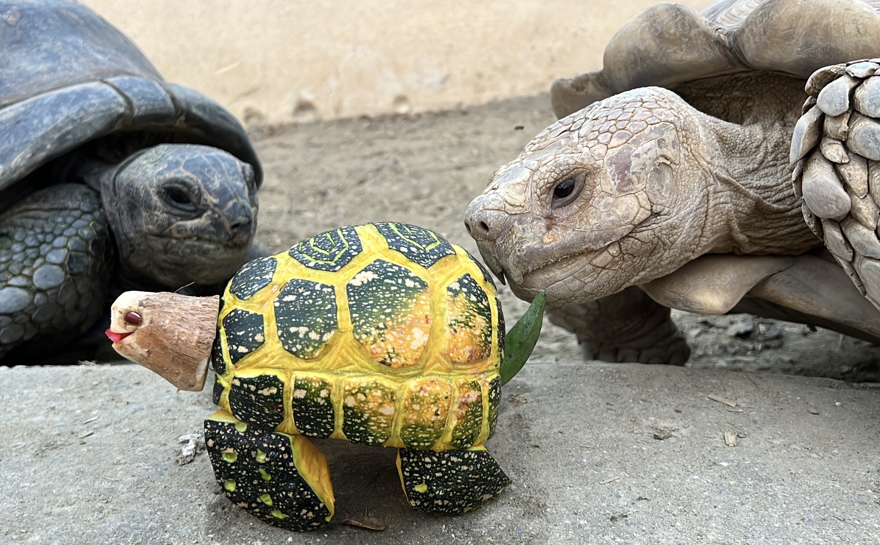 圖說:象龜好奇觀察南瓜造型烏龜。(圖片來源:高雄市觀光局提供)