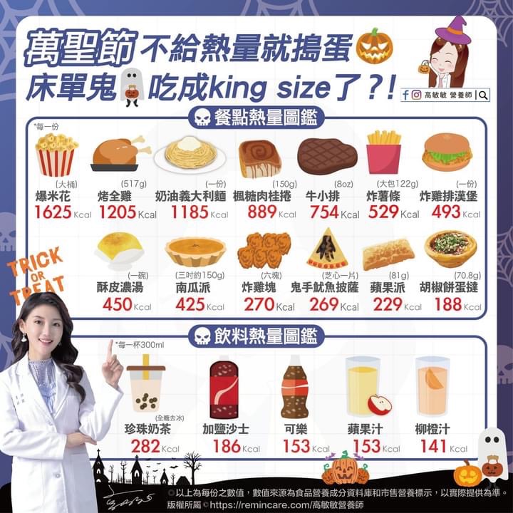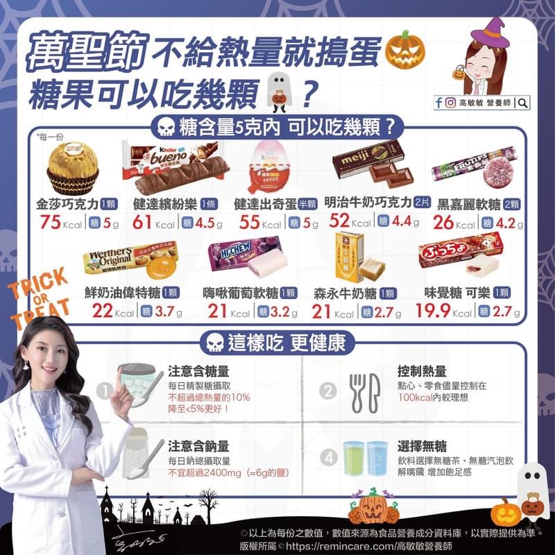 說到萬聖節,當然就是要吃糖果啦!不過糖果的糖含量都很可觀⋯衛福部建議每日精緻糖攝取,不超過一天總熱量攝取10%,最好能降至5%,例如:若每日攝取2000kcal為例,添加糖攝取應低於200kcal(最好更低至100kcal)