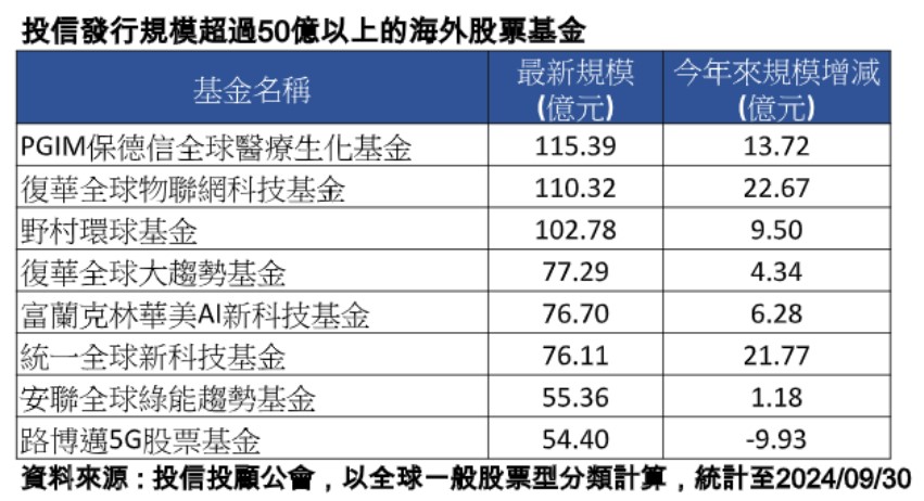 國內ETF市場搶搶滾,另一頭,海外股票基金則是鴨子划水,默默前行,其中,有3檔規模超過百億元,包括PGIM保德信全球醫療生化基金、復華全球物聯網科技基金、野村環球基金,今年規模維持成長,堪稱是人氣基金。